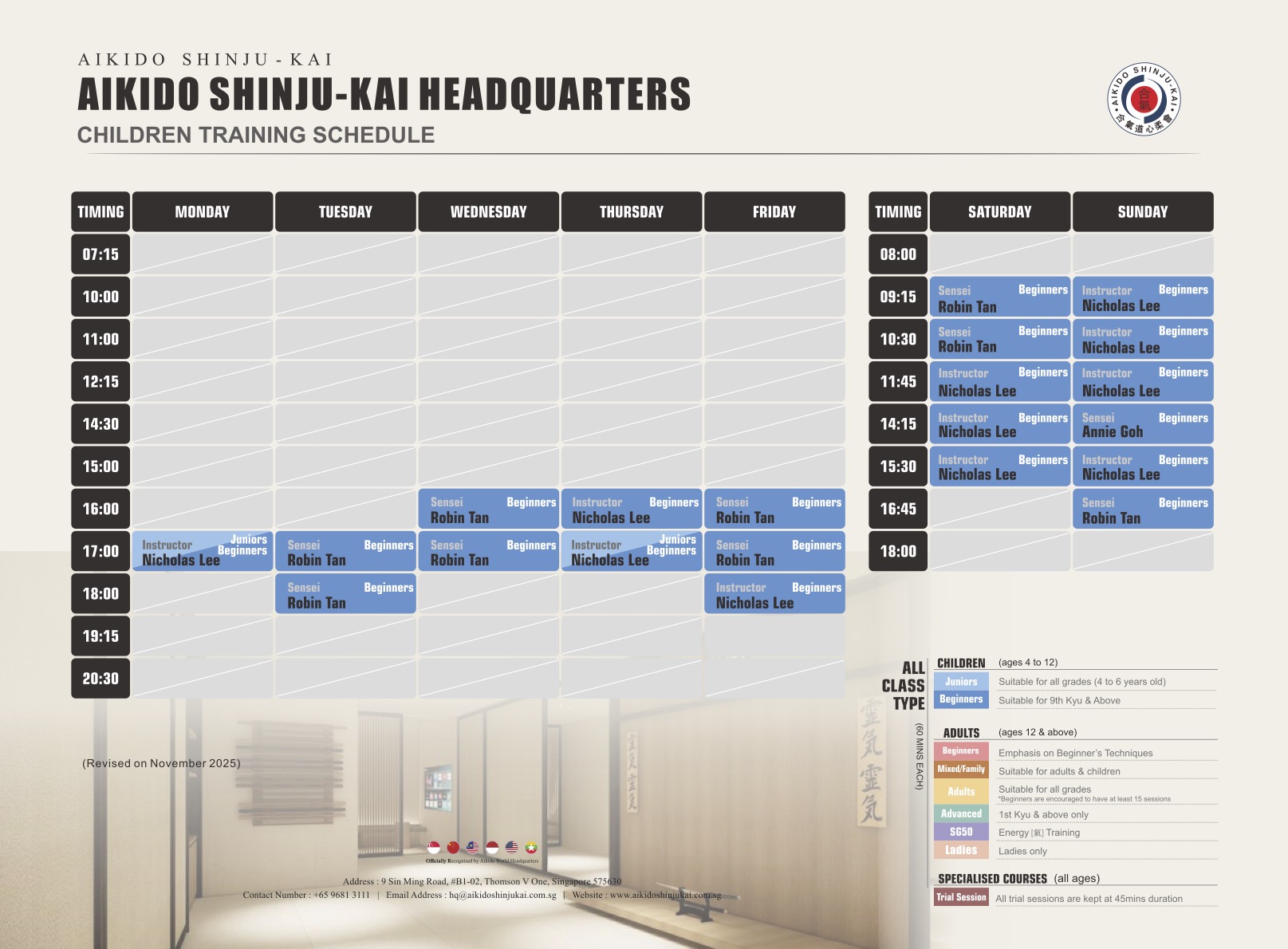 | Beginners | Suitable for beginners to 9th Kyu (Orange Belt) |